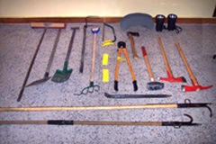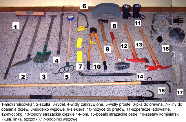 Ręczny sprzęt burzący i pomocniczy Sprzęt służący do prac wyburzeniowych, torowania dojść w miejscach utrudnionych, zawaliskach, otwierania przejść, przecinania krat , kłódek, cięcia elementów drewnianych, prac ziemnych, przeszukiwania pogorzelisk, sprzątania miejsca akcji, a także zabezpieczania linii wężowych.