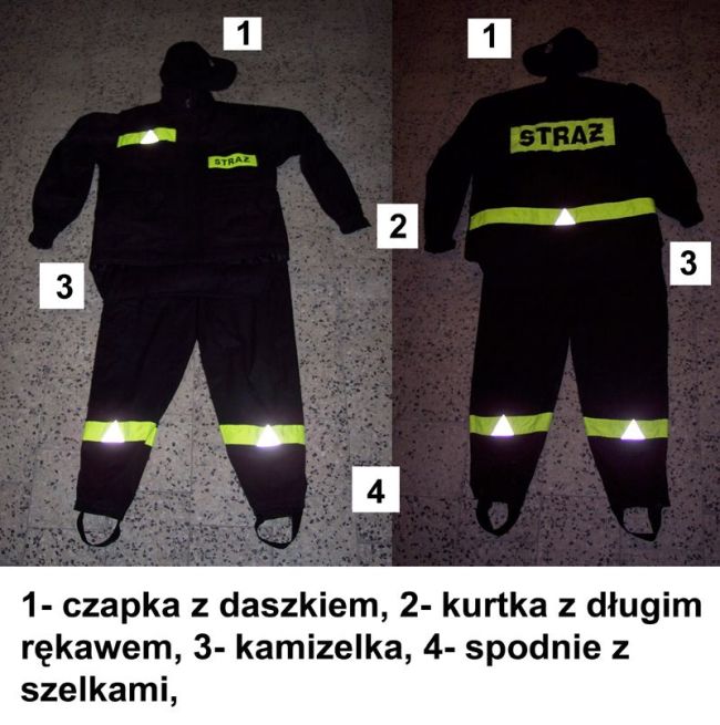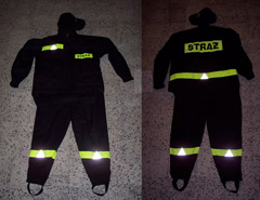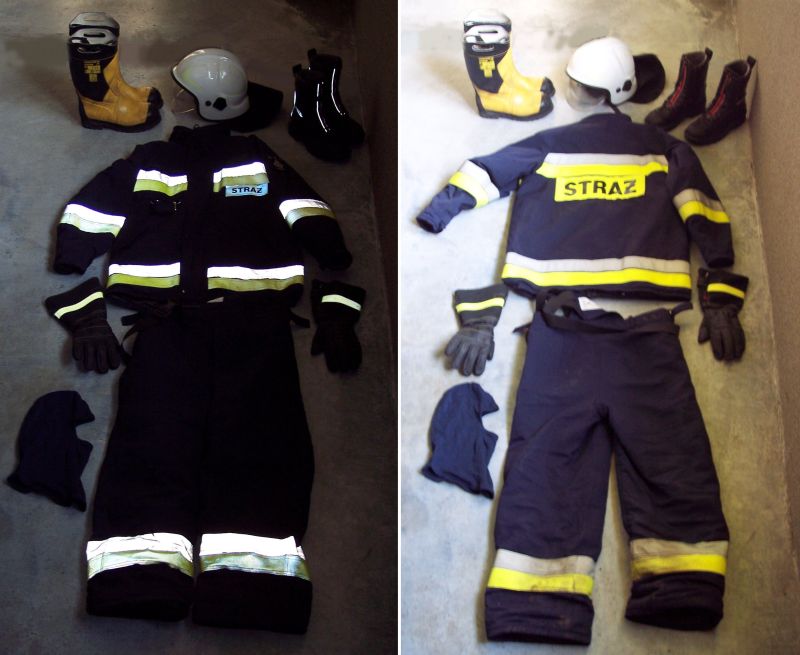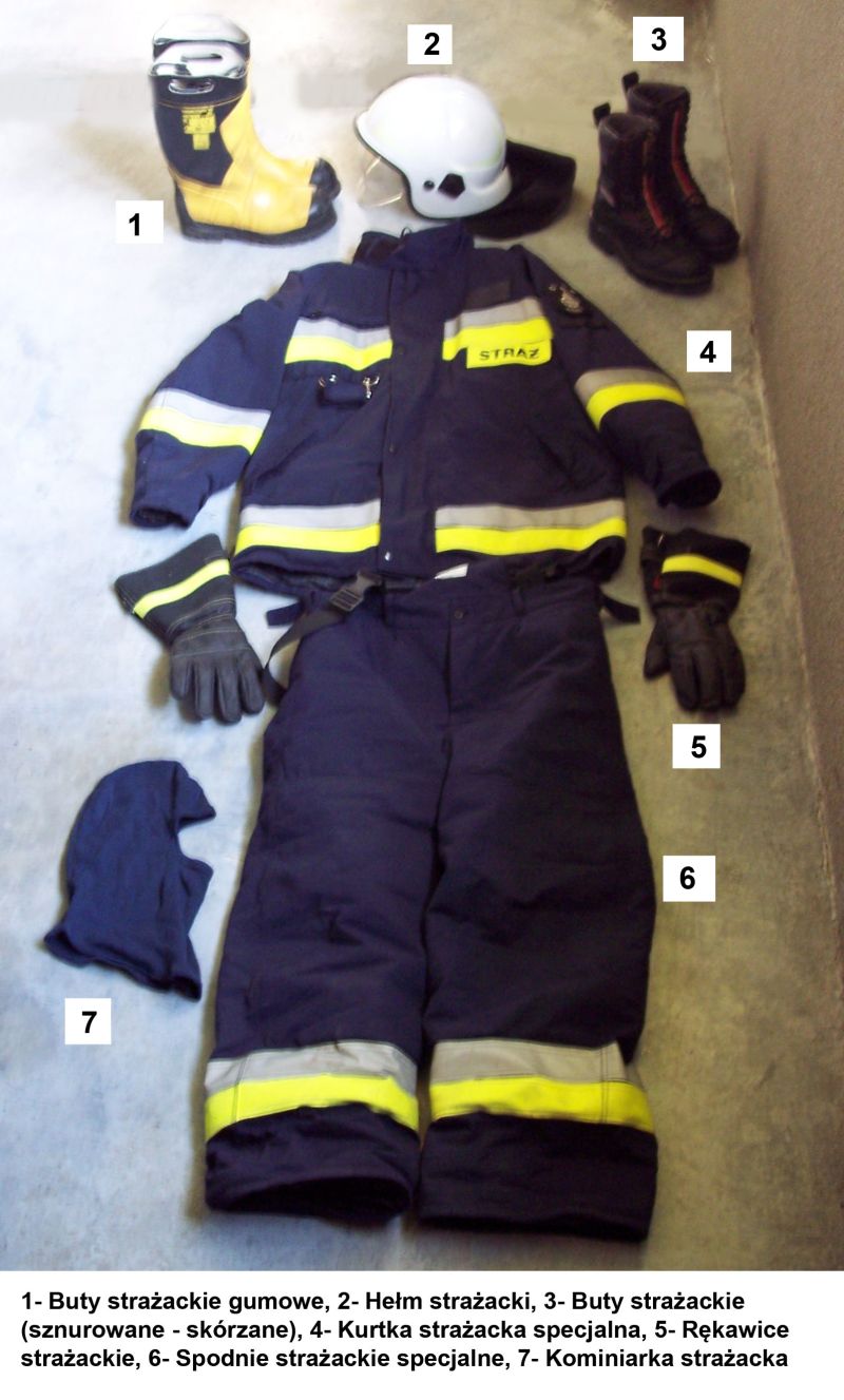 Ubranie strażackie specjalne (kurtka + spodnie z szelkami), Hełm strażacki, kominiarka, rękawice oraz buty strażackie Całość tworzy niezbędny (wymagany przepisami) komplet chroniący przed płomieniem, przenikaniem, ciepła, wody, niektórych substancji chemicznych oraz urazami mechanicznymi. Używane podczas akcji związanych z gaszeniem pożarów, usuwaniem wypadków drogowych oraz wielu innych interwencji. Liczne elementy odblaskowe oraz fluorescencyjne poprawiają widoczność strażaka.