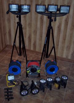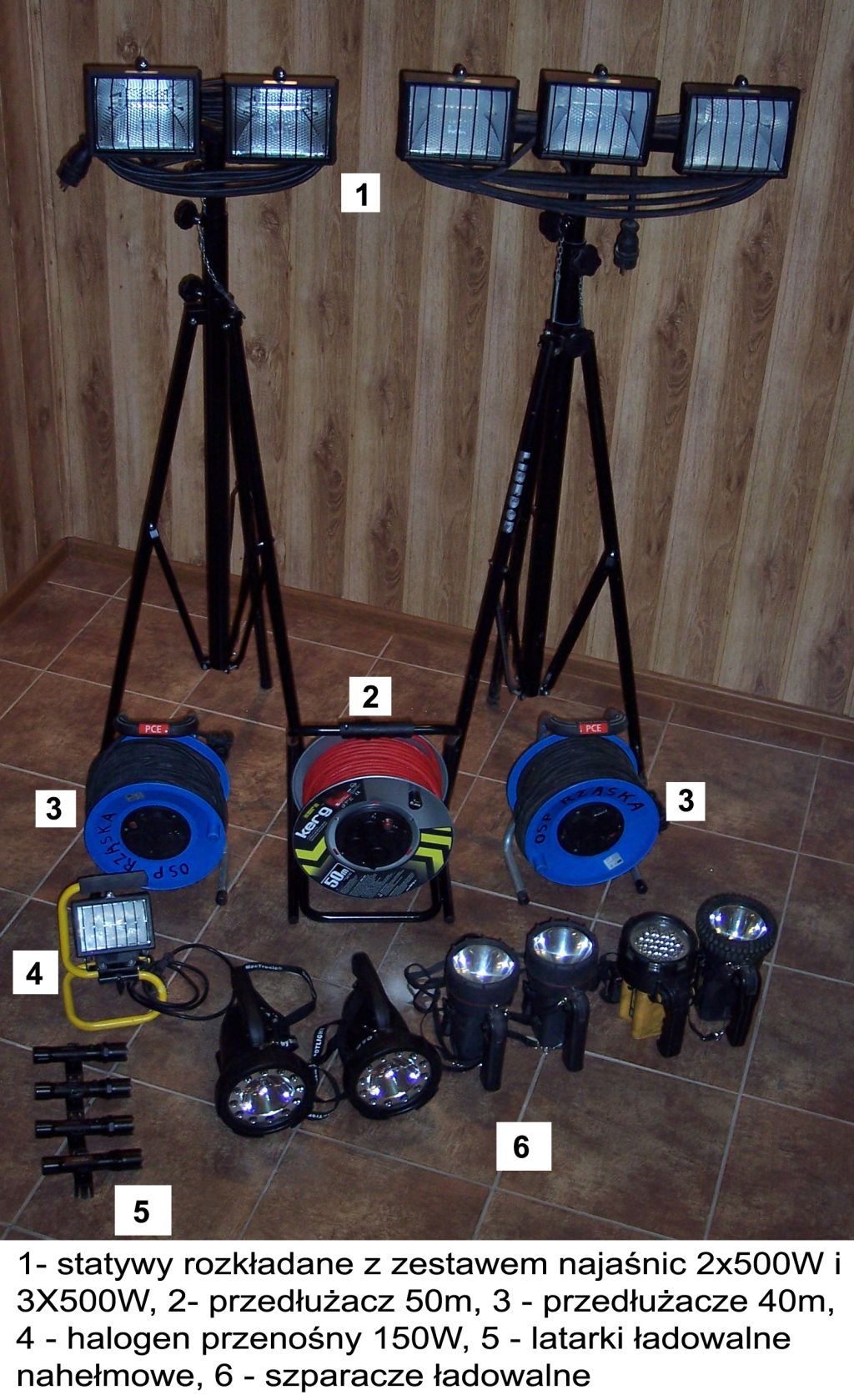 Sprzęt oświetleniowy Sprzęt służący do oświetlania miejsca akcji w nocy oraz w miejscach, gdzie z powodu braku światła dziennego lub awarii stacjonarnego jest to konieczne. Zestaw najaśnic i halogeny zasilane z agregatu prądotwórczego lub innego źródła prądu.