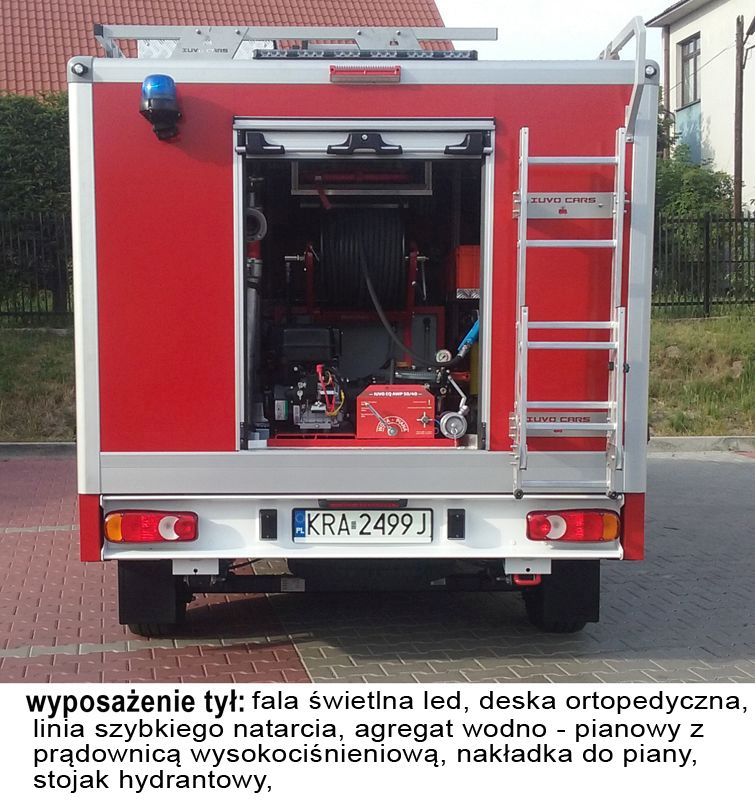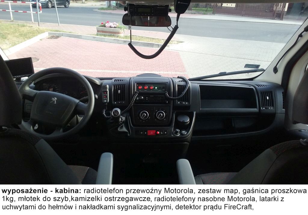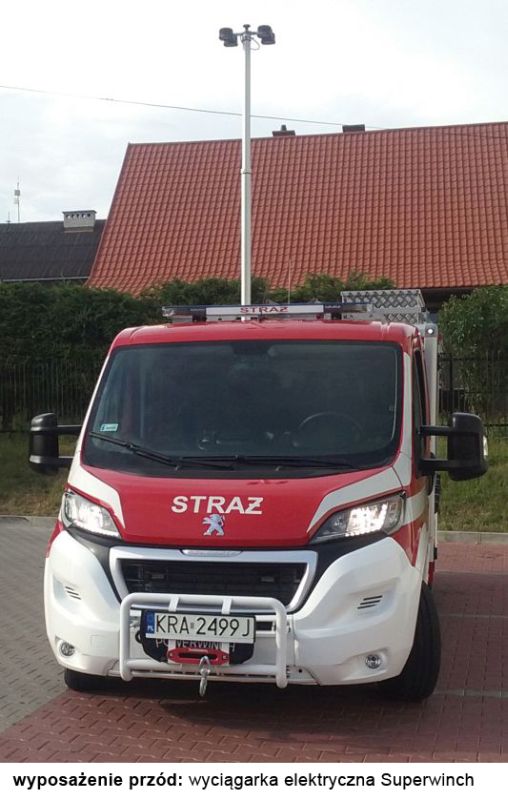 nr.rej KRA2499J , nr.oper. 328K43, Peugot Boxer napęd 4X2, zbiornik 250l., 20l. środka pianotwórczego, agregat wodno-pianowy 50l/min. przy 40 bar, linia szybkiego natarcia 60m., kabina 6 osobowa; Samochód wyposażony w wyciągarkę elektryczną o uciągu 5,5t., ledowy maszt oświetleniowy zasilany z instalacji pojazdu. Najważniejszym jego wyposażeniem jest również fabrycznie nowy zestaw do ratownictwa technicznego, składający się z pompy hydraulicznej oraz nożyc i rozpieracza. Ponadto w skład wyposażenia wchodzi sprzęt typowo gaśniczy, drabina przystawna trzyprzęsłowa, radiotelefon przewoźny i przenośne, agregat prądotwórczy ze statywem oświetleniowym, sprzęt do pracy na wysokości, podręczny sprzęt burzący, sprzęt do zabezpieczenia miejsca zdarzenia, zestaw do stabilizacji pojazdów, gaśnice pianowe, hydronetki plecakowe, pilarka do drewna, przecinarka do betonu i stali, zestaw ratownictwa medycznego R1 z deską ortopedyczną i szynami Kramera, defibrylator AED, sorbent (do usuwania plam olejów lub paliwa z jezdni, placów, itp.). Ponadto w razie konieczności może zabrać motopompę szlamową, pływającą lub PO5 wraz z wężami ssawnymi lub agregat prądotwórczy, a także aparaty ochrony dróg oddechowych (na specjalnie przygotowanym w tym celu stelażu), jak również inny sprzęt nie będący jego stałym wyposażeniem. Pojazd wykorzystywany głównie do szeroko rozumianego ratownictwa technicznego, a także w sytuacjach braku możliwości lub konieczności użycia pojazdu GBA lub wsparcia jego działań oraz w wyjazdach służbowych lub gospodarczych.