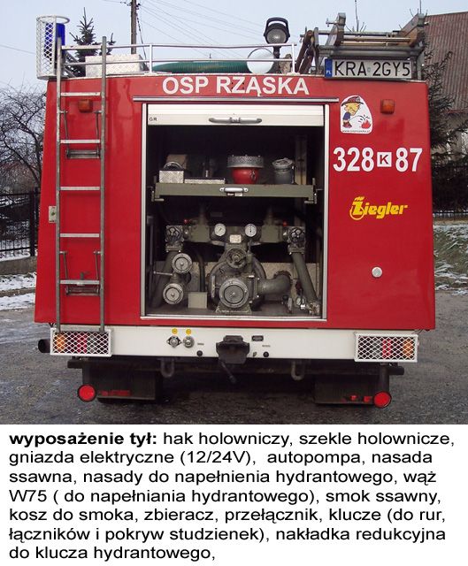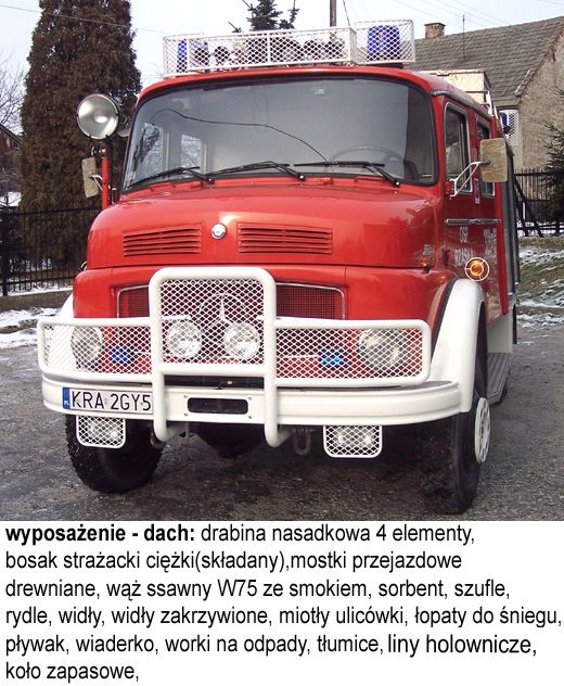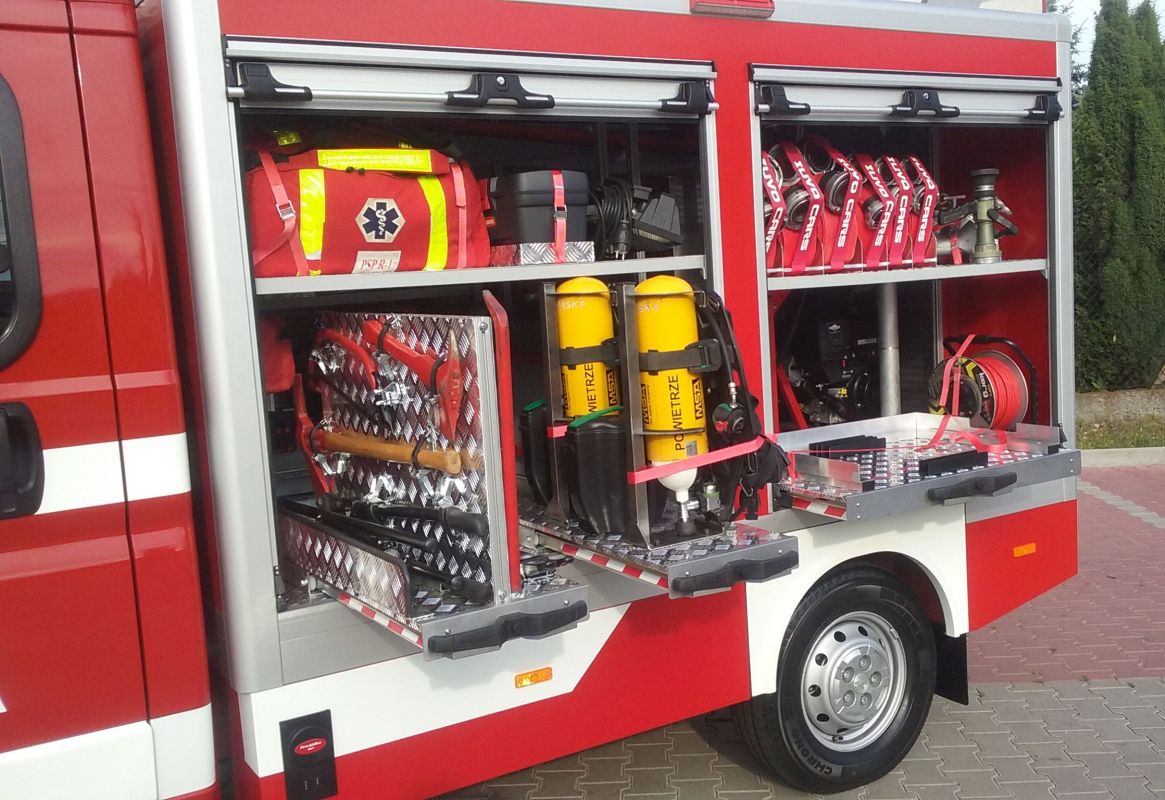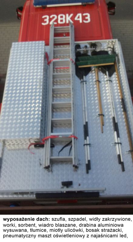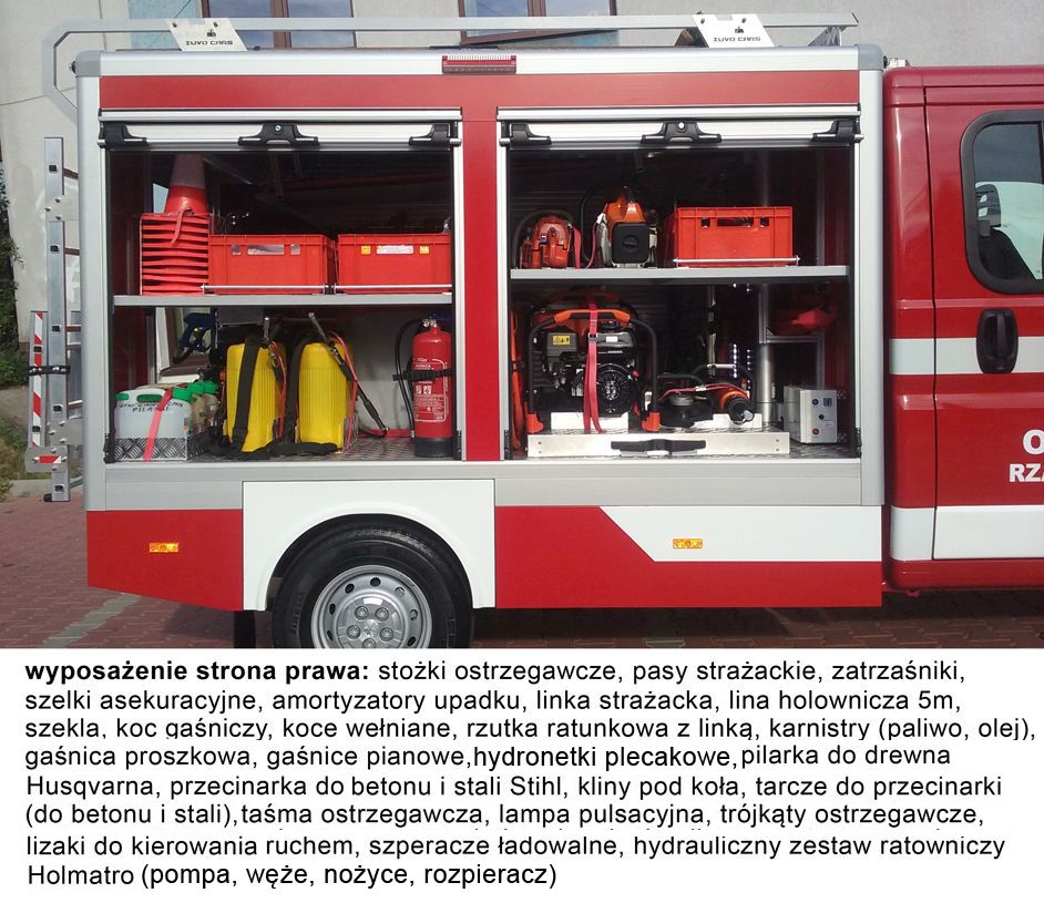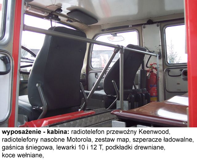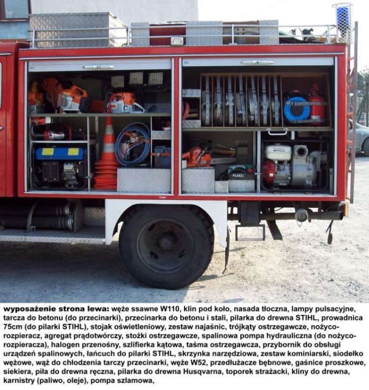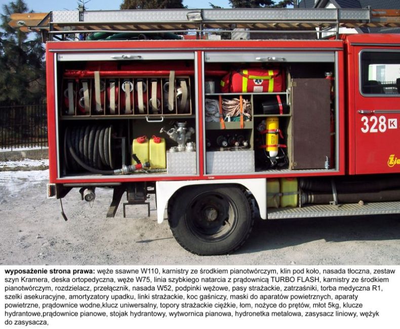 Samochód wyposażony w sprzęt typowo gaśniczy a ponadto radiotelefon przewoźny oraz przenośne, motopompę szlamową oraz pływającą, lekki zestaw do ratownictwa technicznego, agregat prądotwórczy ze statywem oświetleniowym, drabinę nasadkową oraz drabinę dwuprzęsłową wysuwaną liną, pilarkę do drewna, zestaw ratownictwa medycznego R1 z deską ortopedyczną i szynami Kramera, aparaty ochrony dróg oddechowych, sprzęt do pracy na wysokości, podręczny sprzęt burzący, sprzęt do zabezpieczenia miejsca zdarzenia, środek pianotwórczy, spodniobuty do pracy w wodzie, kamizelki asekuracyjne, sorbent (do usuwania plam olejów lub paliwa z jezdni, placów, itp.).