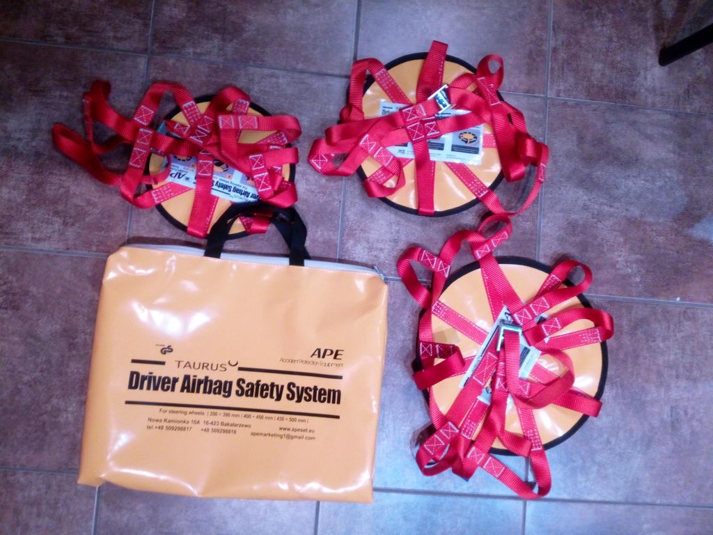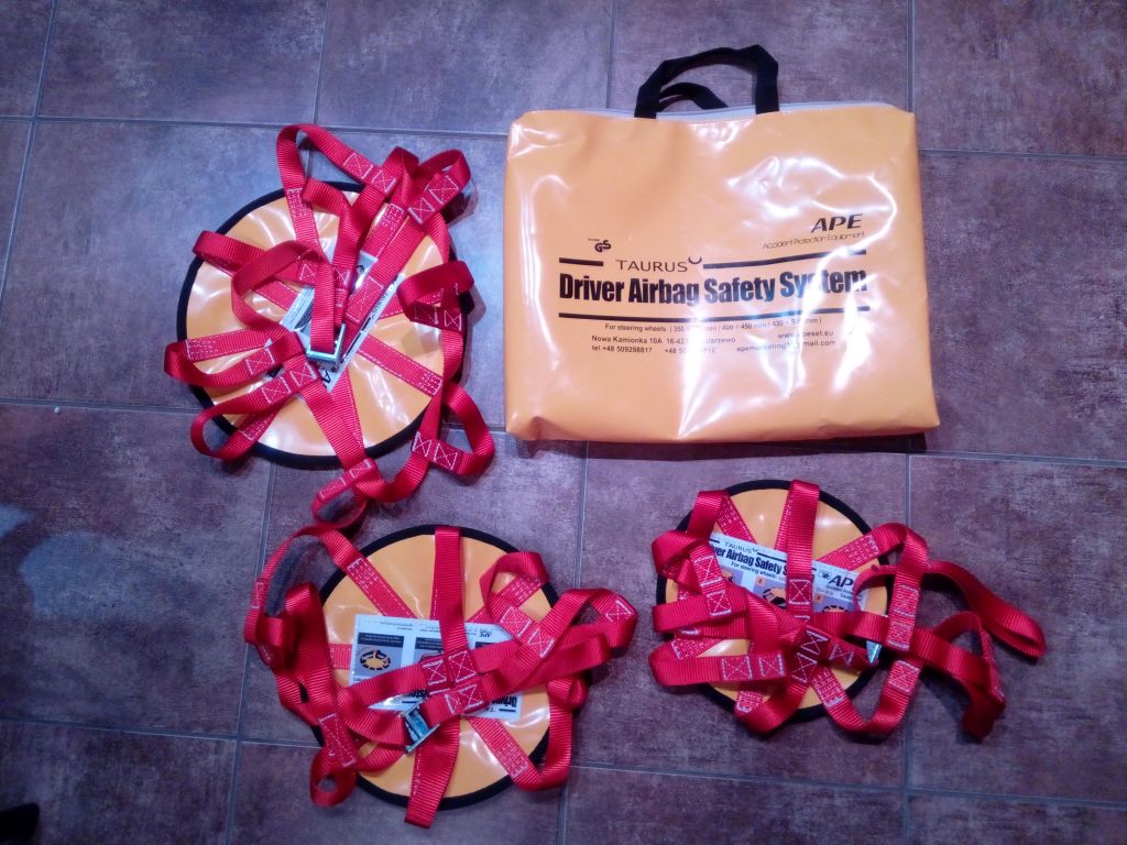 Zestaw osłon poduszek Airbag Safe 3 Zestaw ten zapewnia pełne zabezpieczenie przed skutkami ewentualnego niekontrolowanego uruchomienia się poduszki powietrznej w pojeździe, który uległ wypadkowi i w którym znajdują się poszkodowani pasażerowie. Odpowiednia konstrukcja zapewnia szybki i łatwy montaż osłony poduszki z bezpiecznym i pewnym mocowaniem na kierownicy.