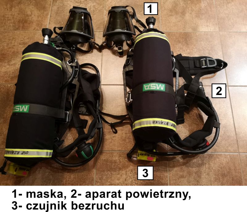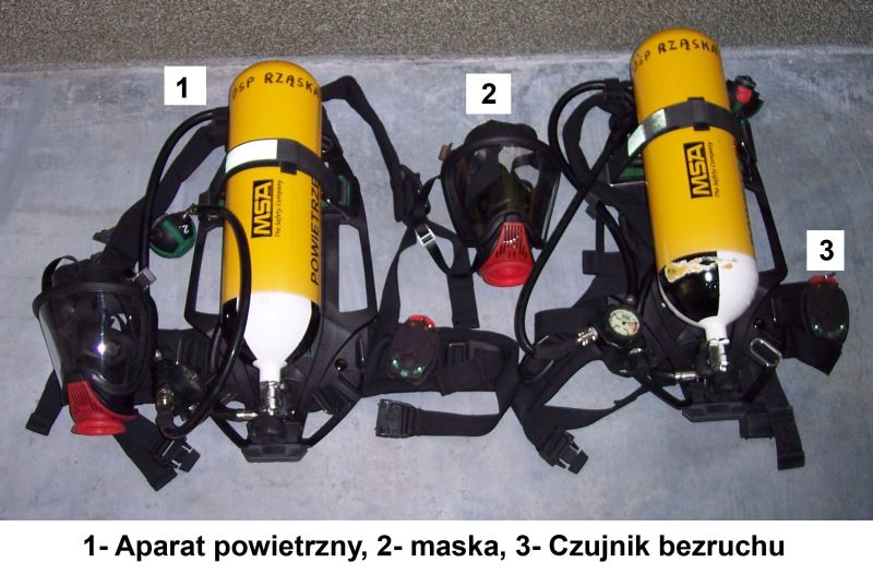 Nadciśnieniowe aparaty powietrzne MSA AUER z maskami G1, butlami kompozytowymi oraz czujnikami bezruchu SUPER PASS II Stosowane do ochrony dróg oddechowych strażaka przed toksycznym działaniem dymu, oparów, a także wysokiej temperatury oraz umożliwiające pracę w warunkach beztlenowych. Stanowiący obowiązkowe wyposażenie kompletu, czujnik bezruchu, sygnalizuje głośnym sygnałem dźwiękowym oraz błyskowym unieruchomienie strażaka, który np. uległ wypadkowi, zasłabnięciu, czy został przygnieciony, a także długotrwałe przebywanie w niebezpiecznej dla strażaka wysokiej temperaturze.