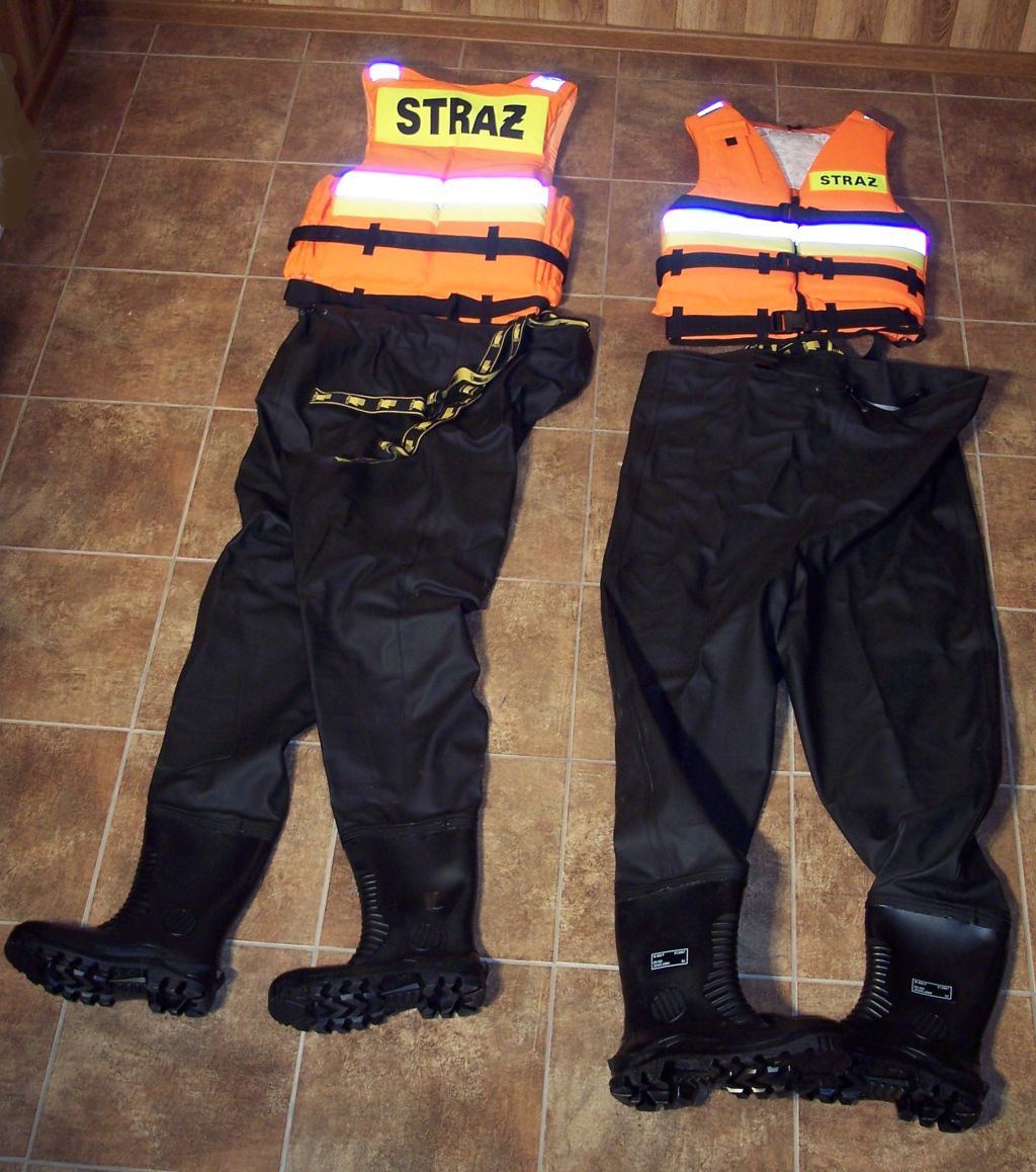 Spodniobuty + kamizelki asekuracyjne Stanowią zabezpieczenie ratowników podczas prac w wodzie, bezpośrednio nad nią oraz na lodzie. Spodniobuty posiadają antyprzebiciową podeszwę oraz wzmocnione noski co chroni stopy w ekstremalnych warunkach. Konstrukcja umożliwia na brodzenie w wodzie do pasa bez ryzyka zmoknięcia. Wzmocniony materiał jest również odporny na rozcieńczone chemikalia. Kolorystyka oraz taśmy odblaskowe kamizelki zapewniają dobrą widoczność ratownika.