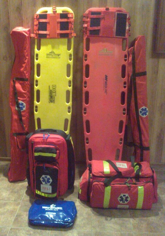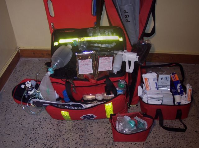 Zestawy ratownictwa medycznego PSP R1 Składają się z torby(można nosić na ramieniu, w ręce lub na plecach) lub plecaka, deski ortopedycznej ze stabilizatorami głowy i pasami oraz szyn kramera(w osobnej torbie). Wyposażenie torby i plecaka spełnia najnowsze wymagania odnośnie tego typu sprzętu z 2013r. W jego skład wchodzi: butla tlenowa z reduktorem, worek samorozprężalny (AMBU) dla dorosłych i dzieci, maseczki i przewody do podawania tlenu, rurki ustno-gardłowe, ssak ręczny, zestaw kołnierzy szyjnych dla dorosłych i dzieci, aparat do płukania oka, nóż do cięcia pasów ze zbijakiem do szyb, opatrunki hydrożelowe(głównie na oparzenia), nożyczki ratownicze, koce ratunkowe, płyn do dezynfekcji rąk, siatki opatrunkowe CODOFIX, gazy opatrunkowe, bandaże, chusty trójkątne, przylepce, rękawiczki lateksowe, folie do przykrycia zwłok, opaski zaciskowe taktyczne, maski krtaniowe, żele schładzające, opatrunki zastawkowe, okulary ochronne, sól fizjologiczna, worki schładzające na amputowane części ciała, itp.