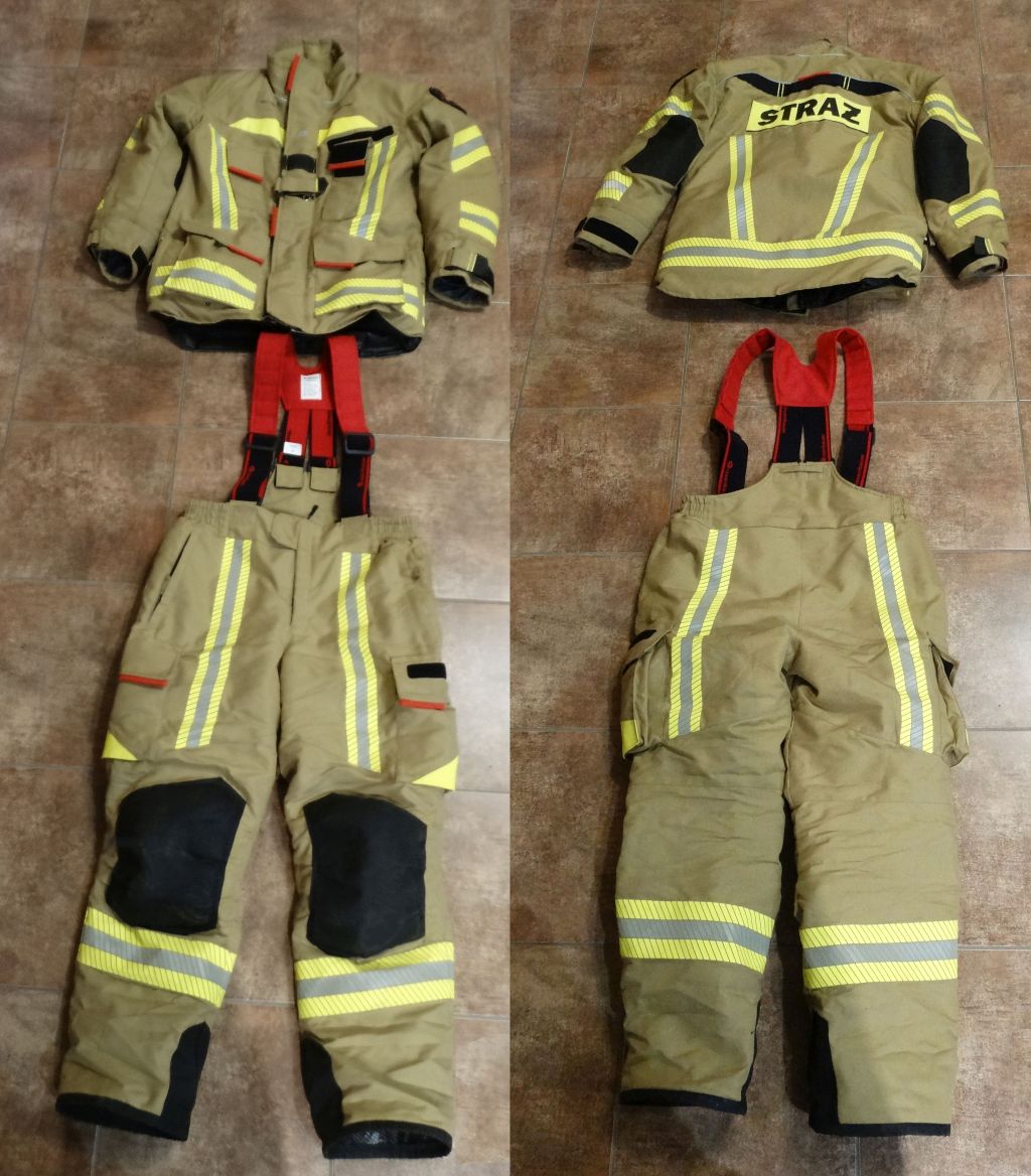 Ubranie strażackie specjalne (kurtka + spodnie z szelkami) piaskowe/gold. Tak jak ubranie specjalne czarne (powyżej) komplet chroniący przed płomieniem, przenikaniem, ciepła, wody, niektórych substancji chemicznych oraz urazami mechanicznymi. Używane podczas akcji związanych z gaszeniem pożarów, usuwaniem wypadków drogowych oraz wielu innych interwencji. Liczne elementy odblaskowe oraz fluorescencyjne poprawiają widoczność strażaka a kieszenie i mocowania pozwalają na noszenie drobnego sprzętu podręcznego. Kolor pieskowy/gold ma za zadanie jeszcze bardziej poprawić widoczność strażaka, zmniejszyć nagrzewanie ubrania podczas upału a przede wszystkim zwiększyć widoczność na ubraniu wszelkich szkodliwych zabrudzeń (produktów spalania, krwi, itp.) i zasygnalizować konieczność wyprania odzieży.